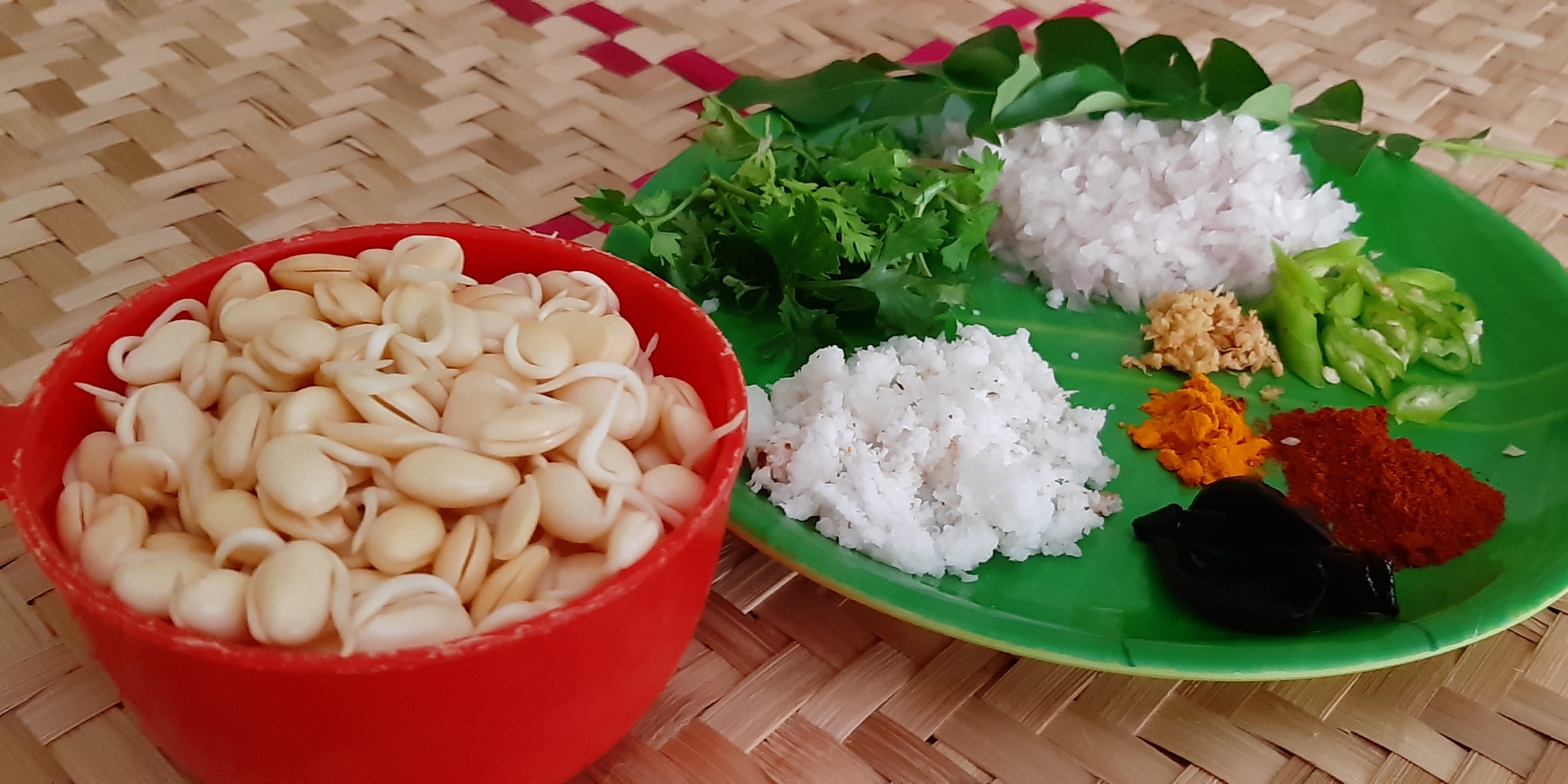 Add waal sprouts stir, cover with a lid and cook till sprouts are somewhat translucent. Add turmeric powder, stir and cover with lid. Pour little water on the lid. Cook on low heat till the sprouts yield to the pressure when pressed. Replenish the water if it dries up.